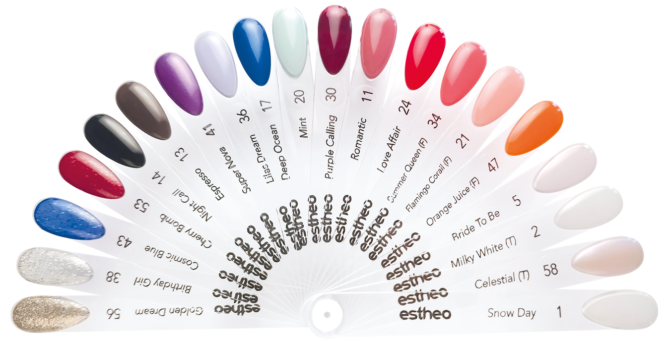 Extendable Abanico color charts in two versions, with individual nails or charts with 3 colors and three systems for assembling the nails: a plastic handle, a metallic ring or a metallic chain.